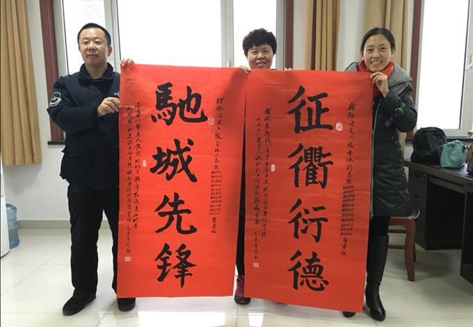 12月23日上午,家住雅苑小區(qū)的兩名乘客來(lái)到公交公司汽車六隊(duì),將親手寫(xiě)的三幅毛筆字作品交到了車隊(duì)工作人員手中。