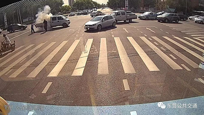 近日,在東營市西二路與北一路路口一輛私家車著火,兩名路過的東營公交駕駛員幫忙撲滅。東營公交在此提醒各位市民夏季行車注意安全。