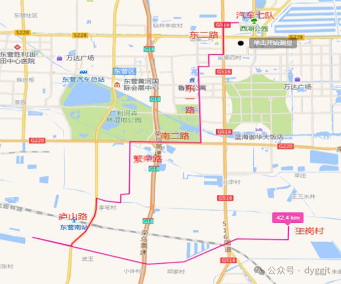線路走向:下行自東營區人民醫院站始發,經玉山路、北一路、西四路、濟南路、太行山路、北一路、千佛山路、順河路、寧陽路、香山路、玫瑰路、玉蘭路到達終點站“玉蘭花園”;上行自“玉蘭花園”站始發,經玉蘭路、紫薇路、香山路,按上述原路線返回。