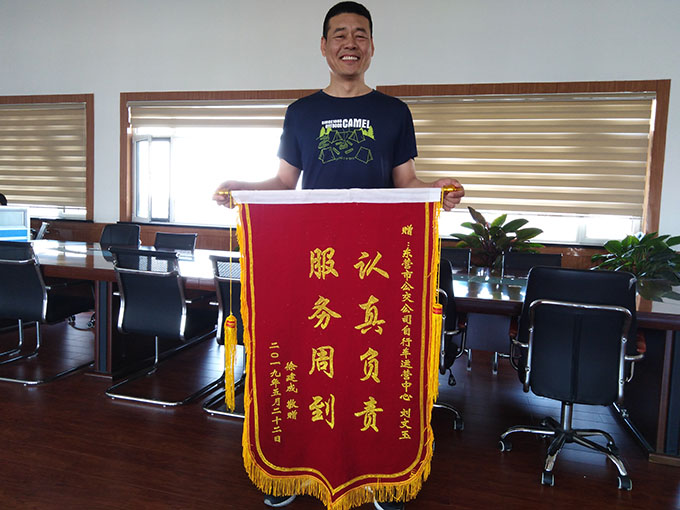 2019年5月28日下午,徐先生拿著一面寫有“認真負責(zé)、服務(wù)周到”的錦旗來到市公交公司公共自行車運營中心,感謝巡檢員劉文玉幫助找回丟失公共自行車認真負責(zé)的態(tài)度和高尚品德。