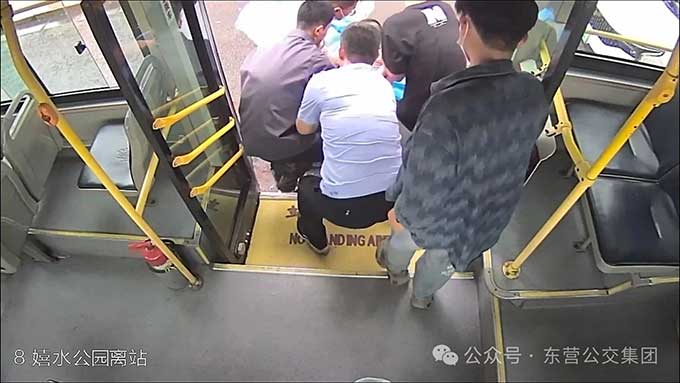 6月2日晚高峰,東營街頭車水馬龍。17時(shí)35分,8路公交駛離東趙大廈站,司機(jī)高希明從后視鏡發(fā)覺有些異常:一名剛換座的乘客低垂著頭,臉上也不正常,緊接著身體緩緩滑落在車廂地板上。