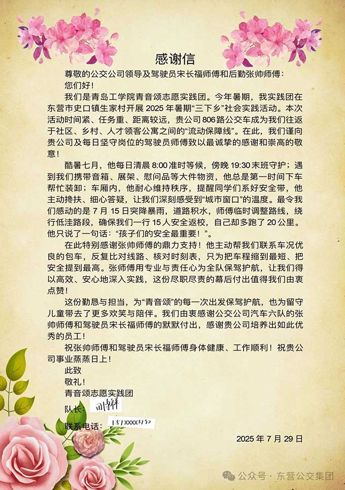 原來,在今年的暑假期間,青音頌志愿實踐團在東營市史口鎮生家村開展2025年暑期“三下鄉”社會實踐活動,負責本次806路班車任務的宋長福細致入微的服務,讓志愿團的師生深受感動。宋長福師傅在執行本次班車任務過程中,自清晨8:00的準時等候,到傍晚19:30分的守護,從幫助師生搬運大件行李,到行車中的安全提醒,細心答疑,特別是在7月15日突降暴雨時及時調整路線,規避積水區域,為保障了師生15人的安全返校,給予了最大的安全守護!